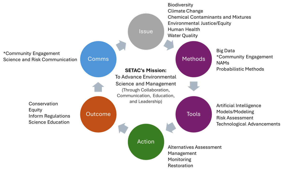 To further synthesize the results, the SC used ChatGPT (GPT-5.3) to explore how categorized keywords could be translated into higher-level scientific themes aligned with SETAC’s mission (center of Figure 1). The following example topics reflect linkages across multiple components of the framework, including issues, methods, tools, actions, outcomes and communications: