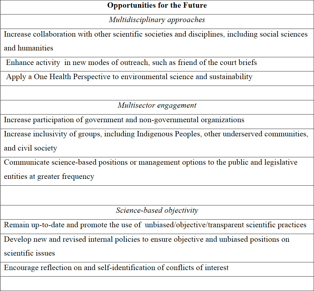 With respect to multisectoral engagement, the authors identify this principle as one of SETAC’s greatest strengths, reflected in Society policies for technical committees, including Pellston Workshop® steering groups. At the same time, they acknowledge the challenge of achieving balanced sector representation in meeting sessions. This is particularly an issue in newer SETAC Geographic Units such as Africa and Latin America, where participation is predominantly academic. While SETAC has sought to mitigate this imbalance – for example, by inviting business and government representatives to special symposia held in conjunction with meetings – a more systematic approach may be worthwhile.