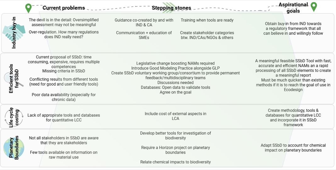 A series of consultations was held between October 2023 and May 2024 to engage the SETAC community. Two were held online and one in-person during the SETAC Europe 34th Annual Meeting in Seville, Spain. As described in a letter to the editor published in Integrated Environmental Assessment and Management by Leopold and coauthors, the consultations followed a step-wise approach. Detailed reports are available for the October 2023, January 2024 and May 2024 meetings. During the first meeting, formatted as a SETAC-Café, participants contributed science-based ideas for improving the SSbD framework, which organizers compiled into a list. From these ideas, priorities were selected for a second meeting, which expanded on them through a provisional roadmapping activity using the same format. We would like to acknowledge Joakim Jeppson, who coached the Sounding Board on a technique of roadmapping developed by the Institute for Manufacturing, University of Cambrige. In the final meeting – an in-person workshop – six different break-out groups each worked on more detailed roadmaps, formulating aspirational goals. These goals were then connected to specific challenges in present reality, and steppingstones were identified to bridge the gap from challenges to aspirational goal. An example of such a roadmap is given below: