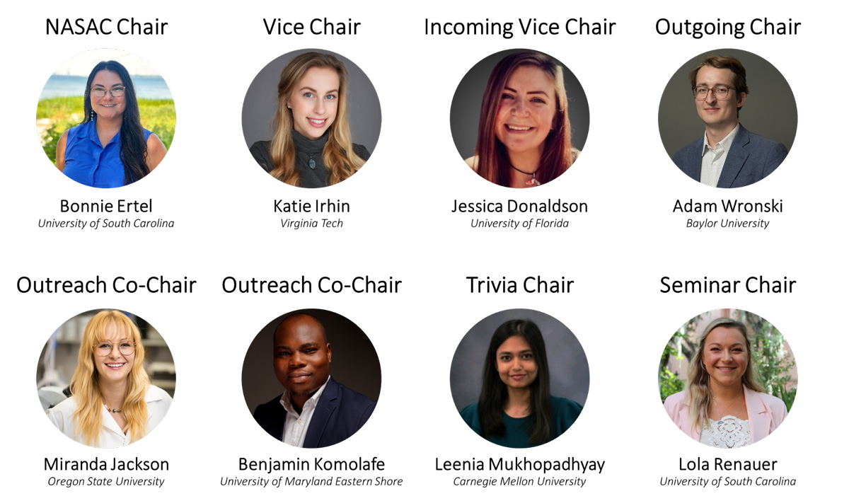At the conclusion of the Portland meeting, Katie Irhin will move into the NASAC Chair role, Jessica Donaldson will become the Vice Chair, and Bonnie Ertel will roll into the Outgoing Chair position. We would like to thank Adam Wronski for his leadership as Vice Chair, Chair and Outgoing Chair, and his continued service to NASAC. We would also like to thank the Outreach Co-chairs, Miranda Jackson and Benjamin Komolafe, who have facilitated student engagement throughout the year. Additional thanks to Leenia Mukhopadhyay and Lola Renauer for their efforts in planning our popular Student Trivia and Mixer and Student Lunch Seminar events, respectively. Finally, NASAC extends sincere gratitude to the student volunteers who provided input to our programming and the sponsors who supported this year’s initiatives. We are proud to see student engagement grow within SNA each year and cannot wait to welcome everyone to Portland for a week of science, community and connection.